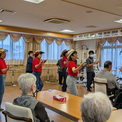 ウエスタンブーツにカントリーハットで、カントリーミュージックはもちろん、なつかしい曲、親しみのある曲にも合わせて軽快に踊ります。