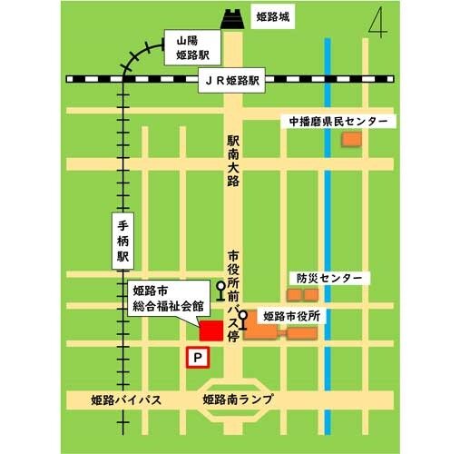 - 路線バスをご利用の場合は、姫路駅(南口)「南21のりば」より約5分「姫路市役所前バス停」下車。市役所前信号を西側へ横断後、南へ約1分。