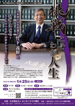 2026年01月06日(火) イベント・講座情報 NEW 公開講座 「挑戦こそ わが人生」参加者募集 イベント情報 主催 社会福祉法人はりまいのちの電話 イメージ画像 開催日 令和8年1月25日(日) 開催時刻 14:00~16:00(開場 13:30) 締切日 定員になり次第締切 会場 アクリエひめじ 中ホール 定員 300名(先着順) 対象者 どなたでも 申し込み方法 Tel、Fax、メール、またはweb申込 費用 無料 内容詳細 はりまいのちの電話では、「挑戦こそ わが人生」をテーマに公開講座を開催します。 今回は、『失明からの再出発 ~人と人のつながりが夢をかなえてくれる~』と題して、日本初の全盲弁護士としてご活躍の 竹下義樹さんが、挑戦と希望の軌跡を語ります。 問い合わせ先 【申込み・問い合わせ】 社会福祉法人はりまいのちの電話事務局 Tel:079-288-5099 Fax:079-263-7210 メール :jimukyoku@harima-inochi.jp 関連URL https://docs.google.com/forms/d/e/1FAIpQLSd8IUtINjci2aKRTYXSO0Ihx8bKLGOJVb-leRAJgbXJrBYdYA/viewform