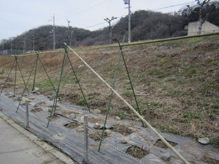 去年の大雨でスズ草花壇が、ゴミに押しやられ壊滅的でしたが、春を前にやっと支柱を立てましたよ。
