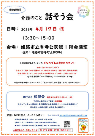 | 内容詳細 | ひめじおんをご覧の皆さま、いかがお過ごしでしょうか。 姫路市香寺町で活動しております、NPO法人 人・こころネットです。 4月19日(日)午後1時30分より、介護のこと「話そう会」を開催します。 ご家庭で介護をされている方や介護の経験がある方が集い、自由に話して いただく場です。 介護専門職グループ「聴く会」メンバーがお話を聴かせていただ きます。 お申し込みは不要です。お問い合わせはホームページかお電話にて承ります。 皆さまのご参加を心よりお待ちしております。 会場までお気をつけてお越しくださいませ。 |