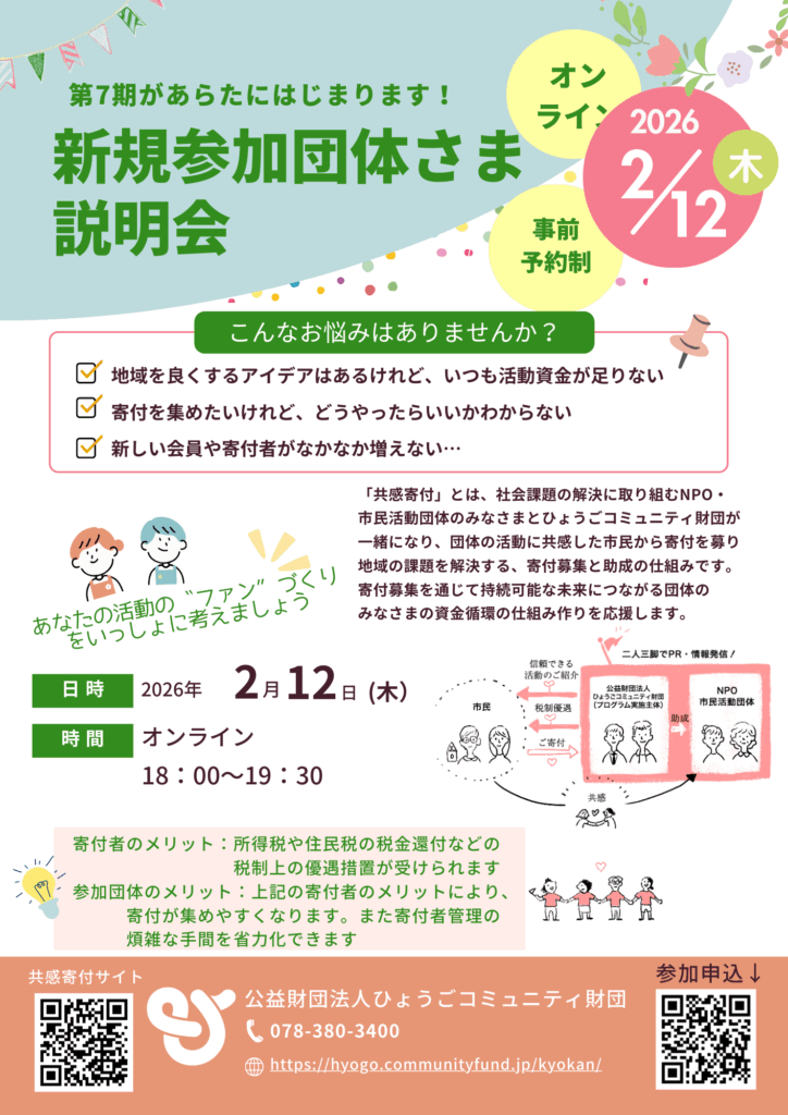 ひょうごコミュニティ財団では、第7期共感寄付プログラムへの新規参加団体の募集を行います。