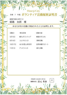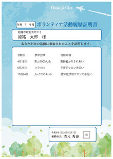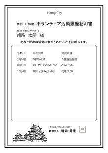 - 活動履歴証明書とは、応募時点での当該年度中または前年度中のボランティア活動履歴(活動日、活動先団体名、活動内容)を一覧にし、その活動履歴を証明するものです。