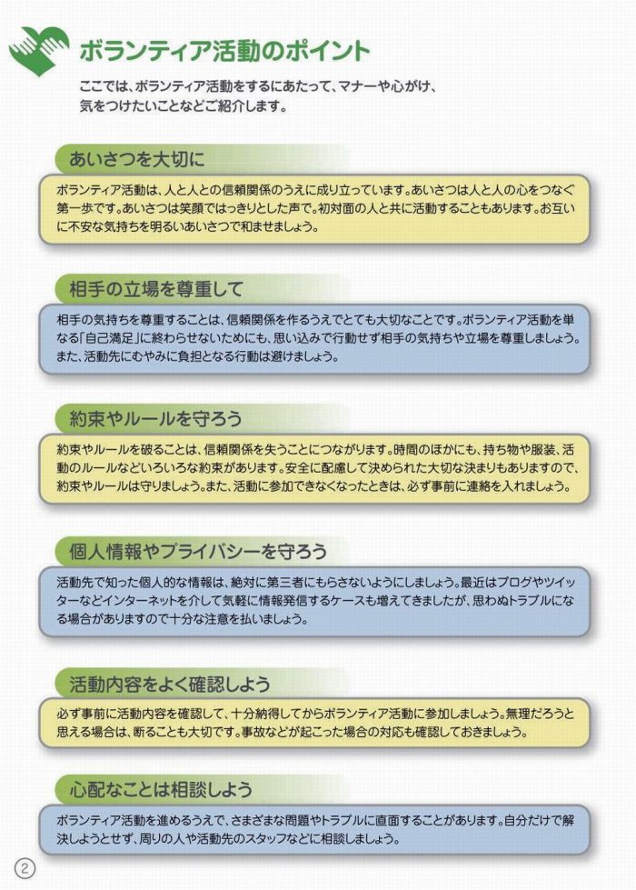 また、災害時にはボランティアが被災地の支援や復興に大きな力となるなど、ボランティアの役割がますます大きくなっています。